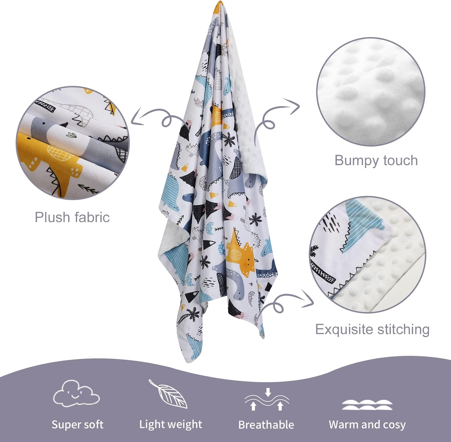 - 1.【Warm & Cosy】We use super soft minky fleece. Double-sided reversible design offer you different soft with one side of smooth and 3D dotted to the other. Light and breathable, warm and cosy,like mother's touch,will help calm little ones. Treat children to restful naps and cozy nights. suitable for baby boy or baby girl.