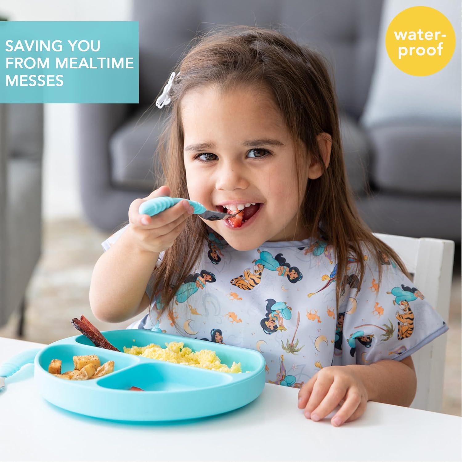 - SAVING YOU FROM THE MESS – Offers generous coverage to help you save an outfit; made from Bumkins’ original waterproof fabric – 100-percent polyester embedded with TPU; easy-to-wipe and machine washable