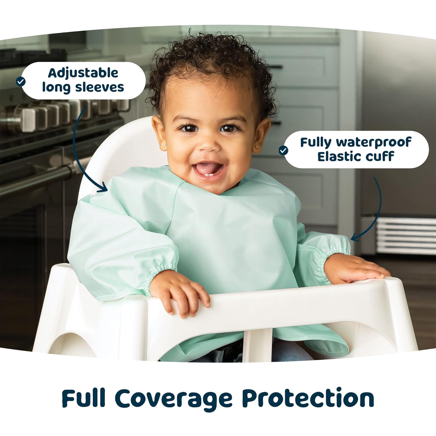 - TRAVEL BUDDY:The must-have baby feeding essentials for on-the-go parents! Our long sleeve waterproof smock bib (fits 6-24 months) is a versatile wipeable bibs with scratch-free closures and 360 degrees puree-proof protection.This bib with sleeves is perfect for plane or car meals, It folds flat in diaper bags,handles baby-led weaning messes and makes a great gender-neutral baby shower gift.Ideal for parents needing baby eating essentials on the go.
