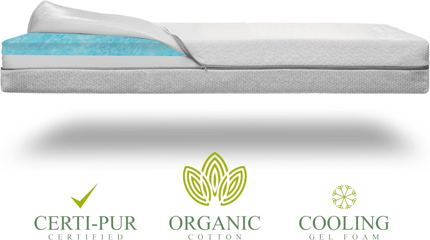Organic Cotton Dual-Sided Crib Mattress | 2-Stage Premium Memory Foam CertiPUR-US Hypoallergenic Baby Mattress, Firm Support for Infant, Cooling Gel for Toddler, Waterproof Washable Cover, 52x27.5x5.5