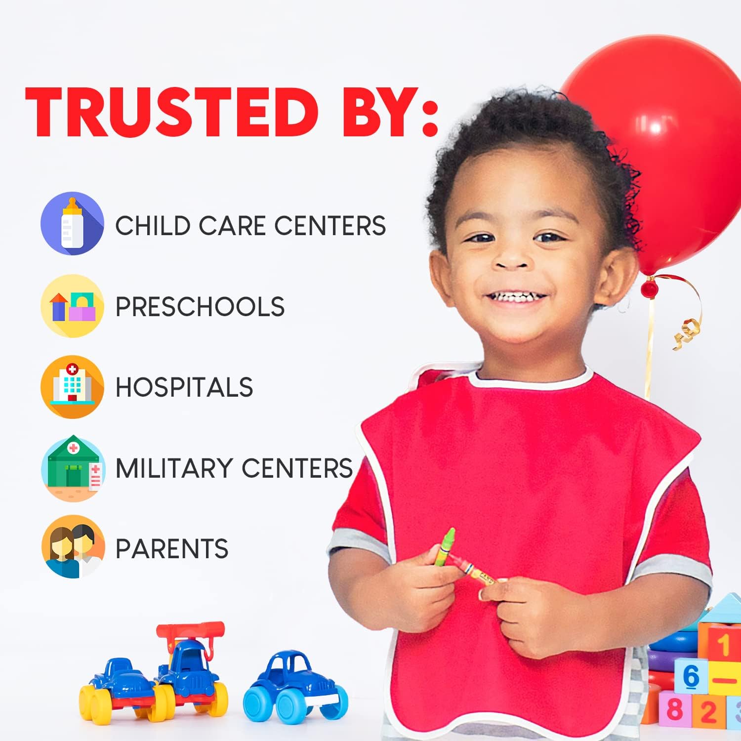 - EXTRA WIDE COVERAGE KEEPS SPILLS OFF - Because even though there is no pocket, Toppy Toddler bibs are longer and wider than most. So clothes stay clean. Although some bibs have pockets, most of the time food still finds its way to the floor or lap area. And as good as crumb catchers are, this bib gives you 20 percent more coverage with an impressive 13" x 18" surface area. Almost 12" from the neck down. That's 235 square inches of total protection extending to the lap area too.