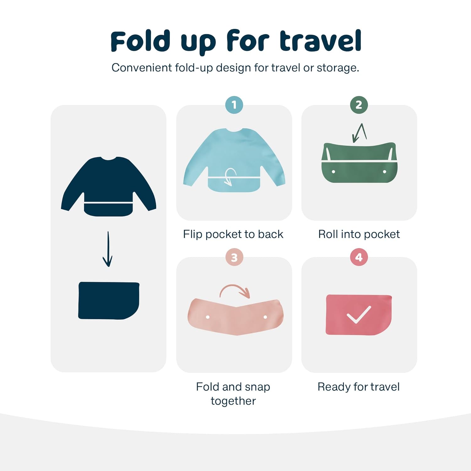 - TRAVEL BUDDY:The must-have baby feeding essentials for on-the-go parents! Our long sleeve waterproof smock bib (fits 6-24 months) is a versatile wipeable bibs with scratch-free closures and 360 degrees puree-proof protection.This bib with sleeves is perfect for plane or car meals, It folds flat in diaper bags,handles baby-led weaning messes and makes a great gender-neutral baby shower gift.Ideal for parents needing baby eating essentials on the go.
