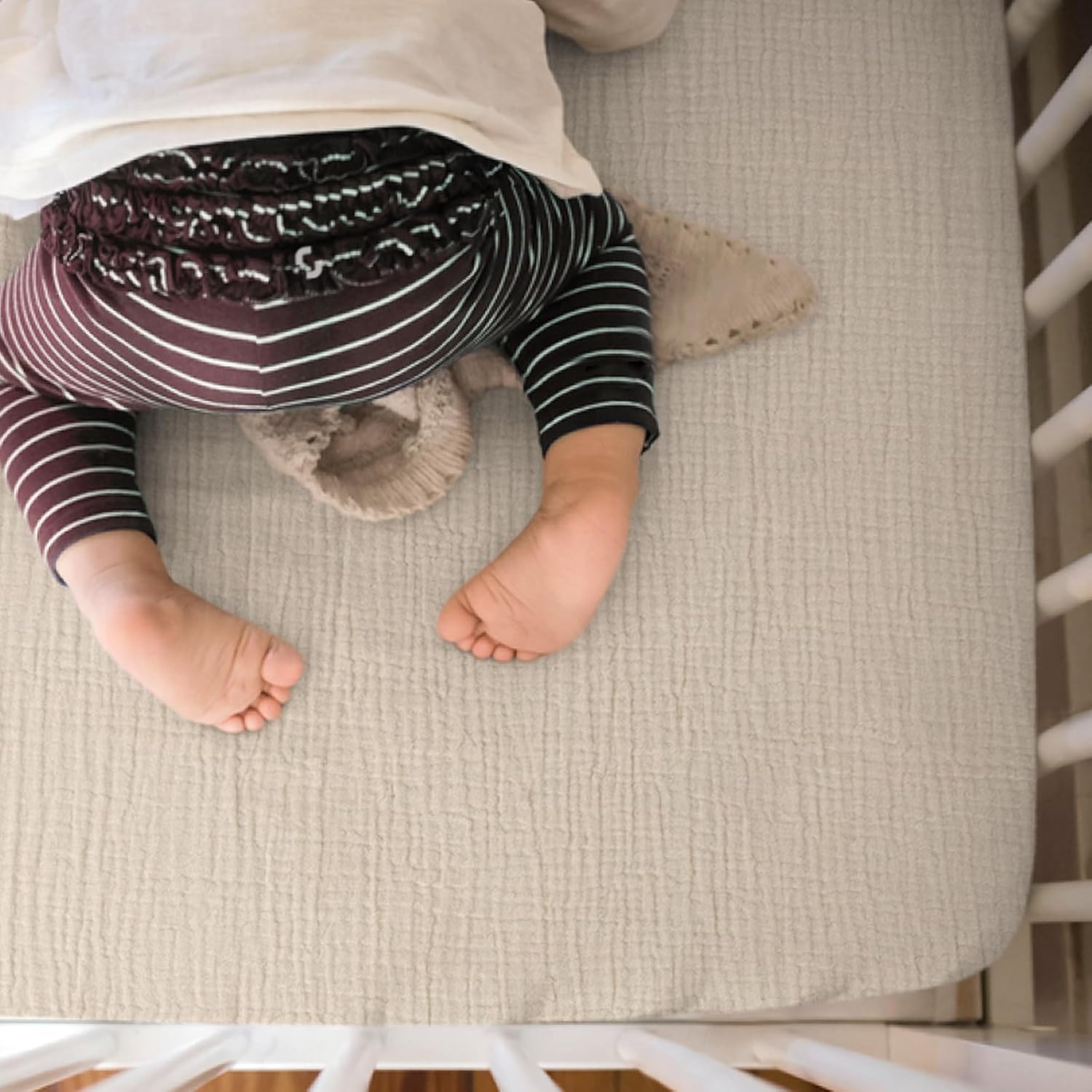 - Muslin Cotton: The muslin mini crib sheets are soft and breathable to give your baby a cozy place to sleep. They make a smoother transition from snuggled in your arms to safely sleeping in their mini crib.