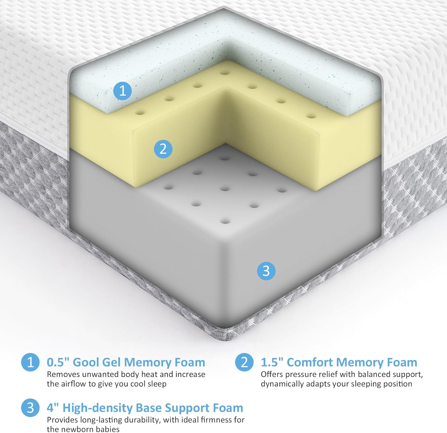 - 【Breathable & Comfortable Mattress】 Integrated with Gel-infused memory foam, open-cell memory foam and high-density support core, the triple-layered mattress helps to regulate temperature by accelerating air circulation and transferring unwanted heat away from the body, giving your baby a cool and comfortable sleep environment, thus ensures a through-the-night sleep