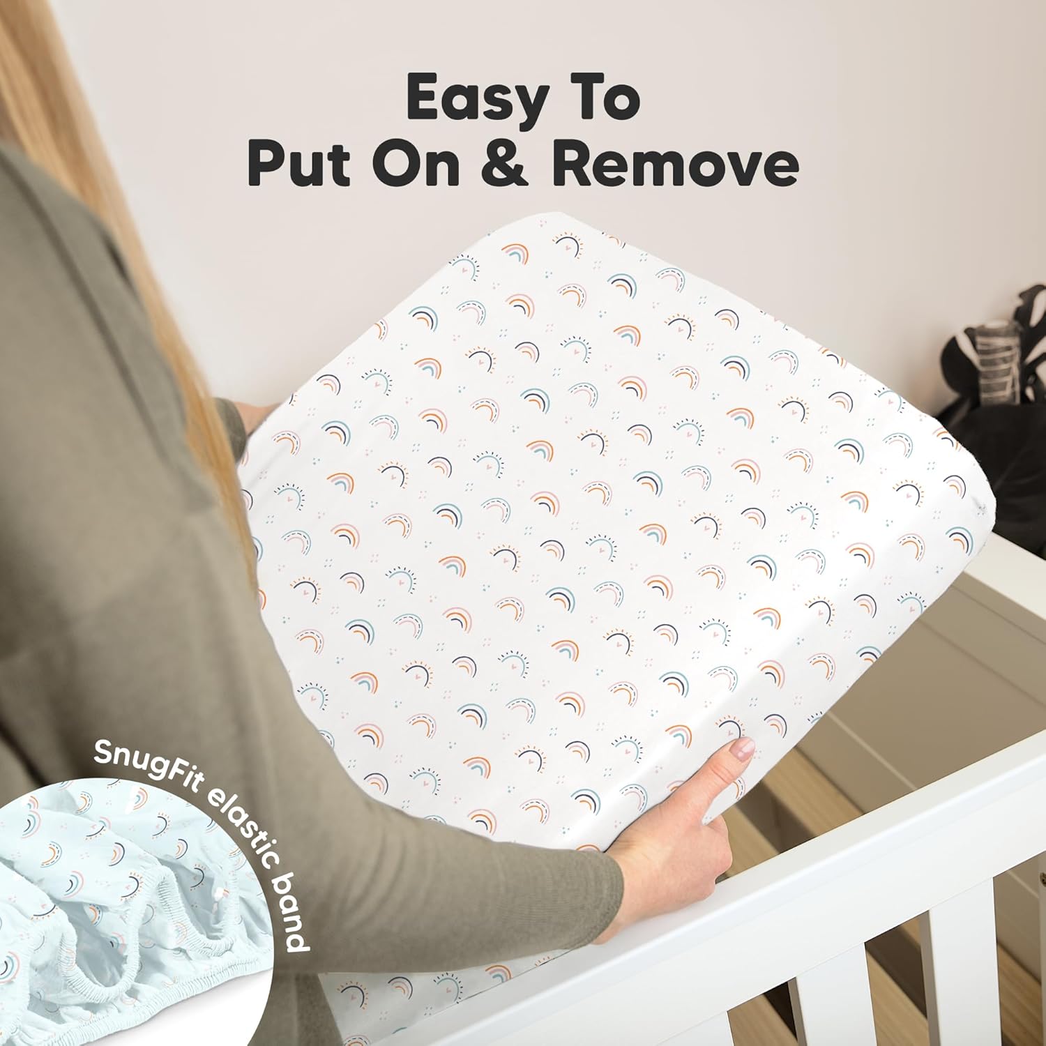 - High Quality Elastic Band - Our organic cotton crib sheets, use premium elastic SnugFit Band seamlessly concealed to ensure these standard crib sheets stay in place securely for safe and soothing sleep.