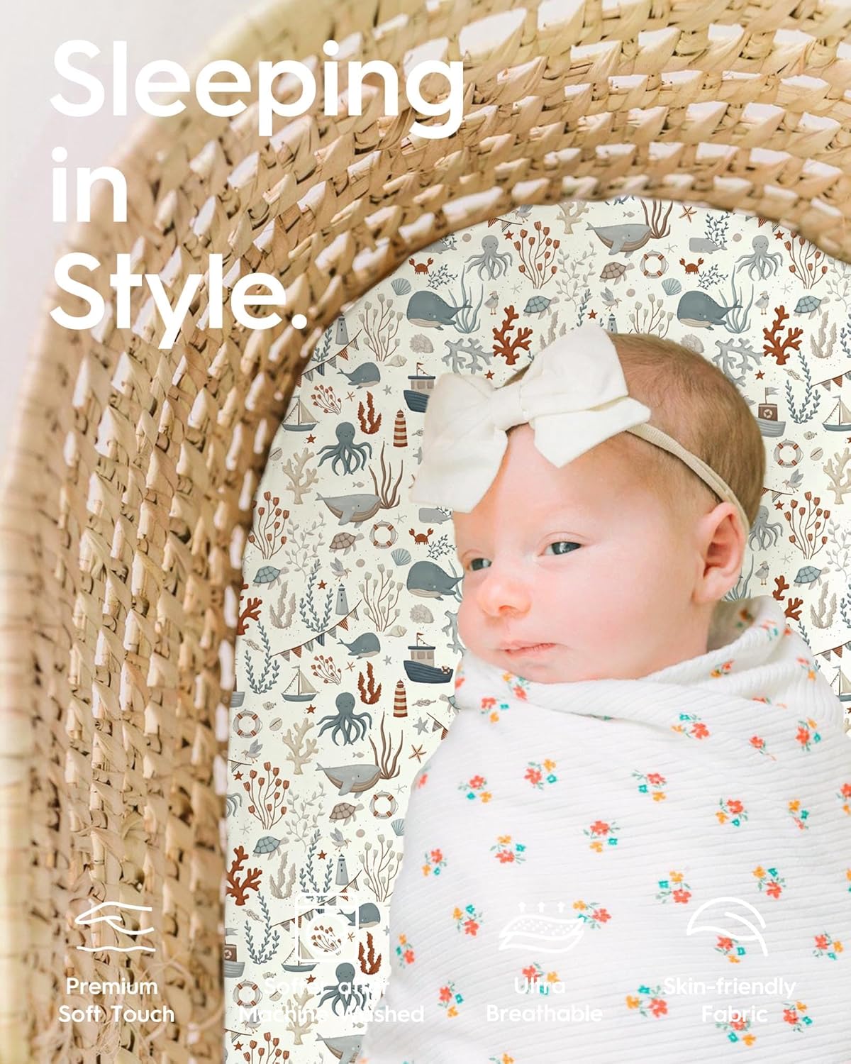 - ULTRA SOFT & SKIN-FRIENDLY: Our bassinet sheets are crafted from premium soft jersey rayon cotton, providing a royal treatment for your baby's delicate skin. Say goodbye to rashes and unwanted skin infections! With each wash, our bassinet mattress sheet grows even softer and more pliable, embracing your baby's bassinet mattress and gently caressing their precious skin.