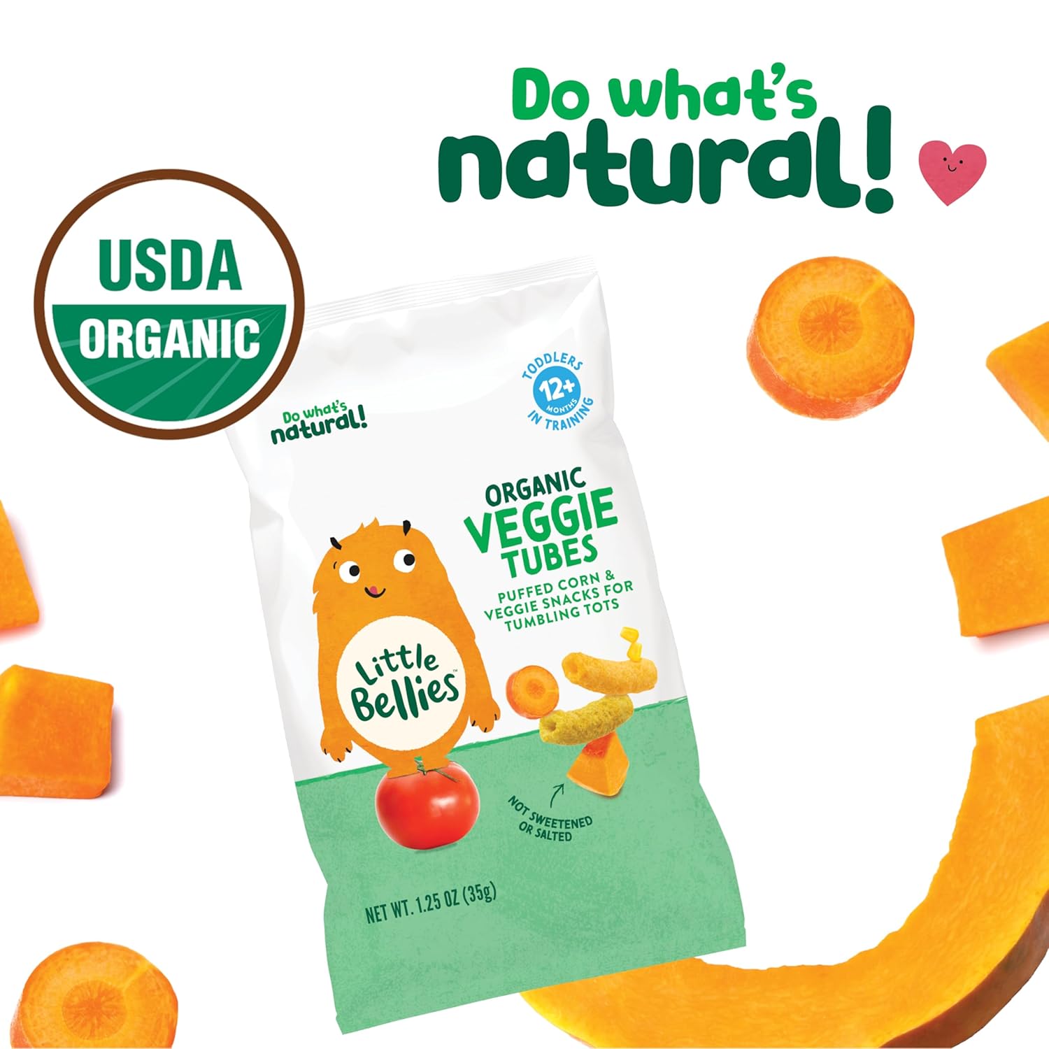 - Organic mixed veggie & corn tubes baked for a crunchier texture, introducing intrepid little adventurers to sensory explorations with new fun shapes & colors.