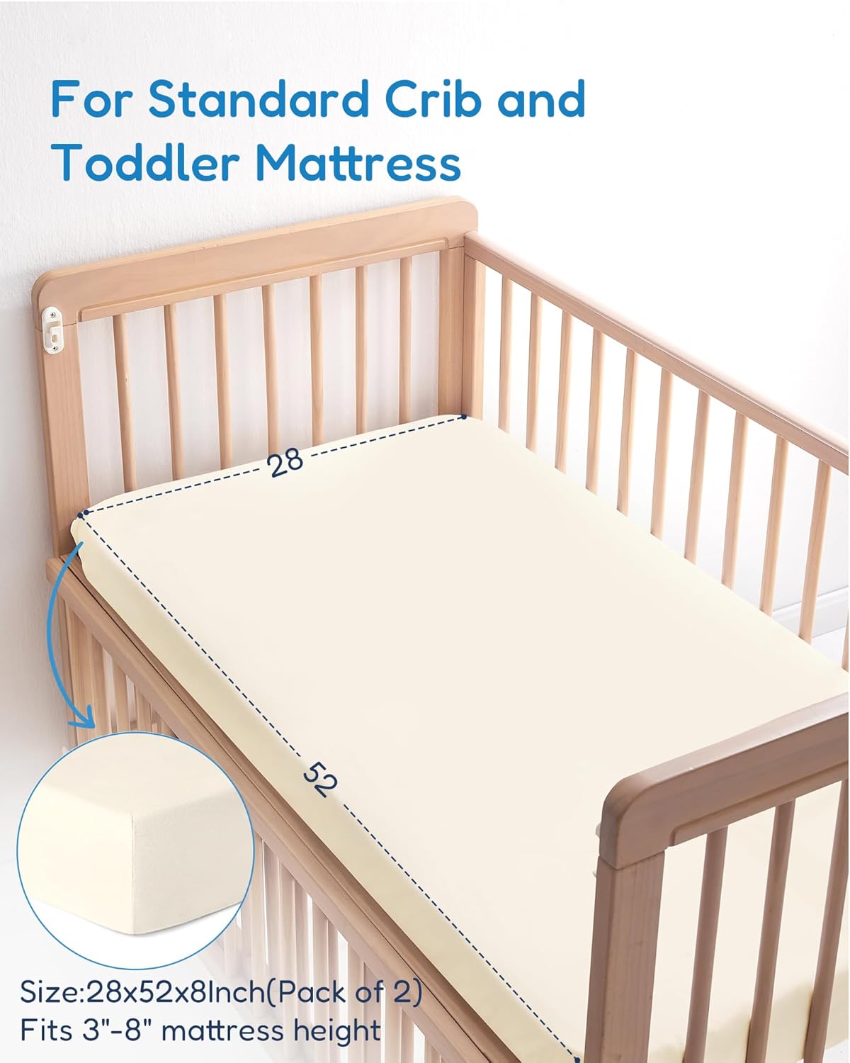 - 2-Pack toddler bed sheets: Each TotChill crib mattress sheet set includes two perfectly sized sheets for standard crib mattresses (52” x 28” x 9”), designed to fit snugly and securely for both boys and girls.